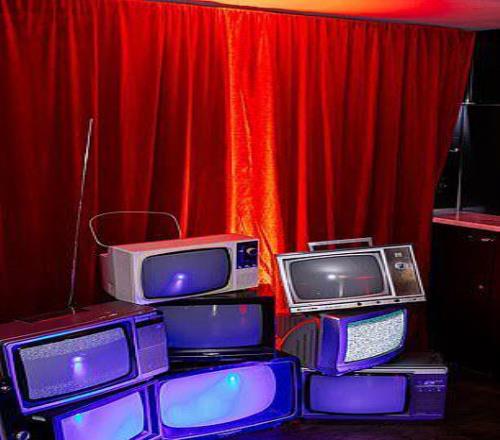 内部,一堆老式电视机在红色的灯光下闪烁,墙上贴满了“通缉令”海报