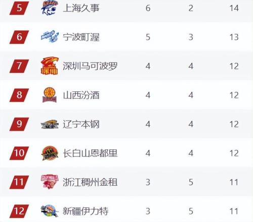 第5-12的排名变化幅度也很大,上海落后青岛一个身位继续稳坐第5,本轮输球的山西让出第6下滑到第8,大黑马宁波连升3名来到第6,深圳在击败辽宁后也连升2名来到第7。