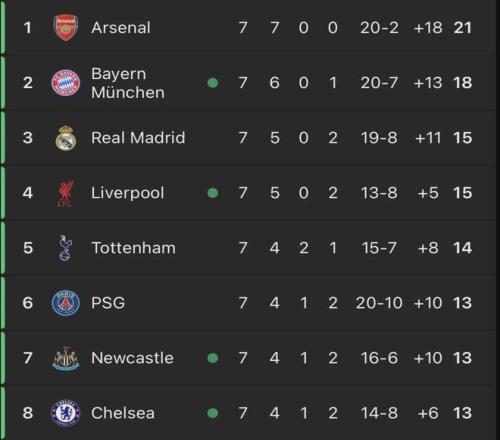 北京时间1月22日,欧冠联赛第七轮比赛全部结束。而在排名前8的球队之中,竟有5支英超球队,分别是:阿森纳、利物浦、热刺、纽卡和切尔西。而6支英超参赛球队中,仅本轮爆冷输球的曼城无缘前8。瓜迪奥拉的球队以净胜球劣势,暂居欧冠联赛阶段第11位。即便曼城未能跻身前8,但英超第一联赛在欧冠的统治力显露无疑。